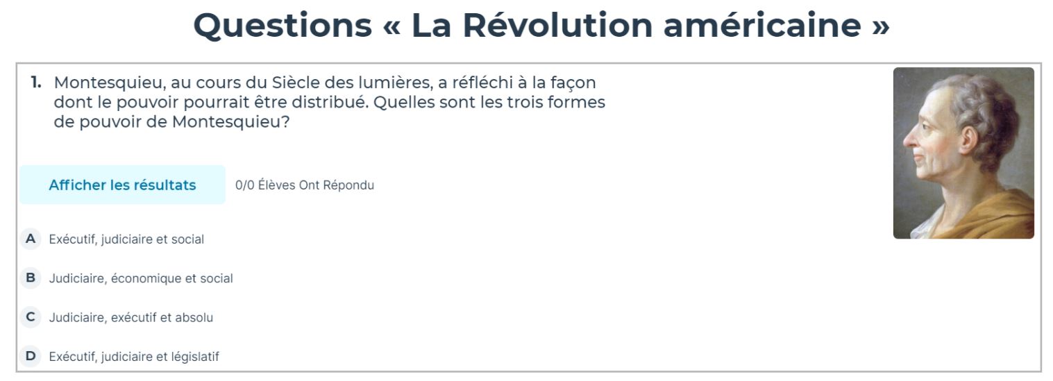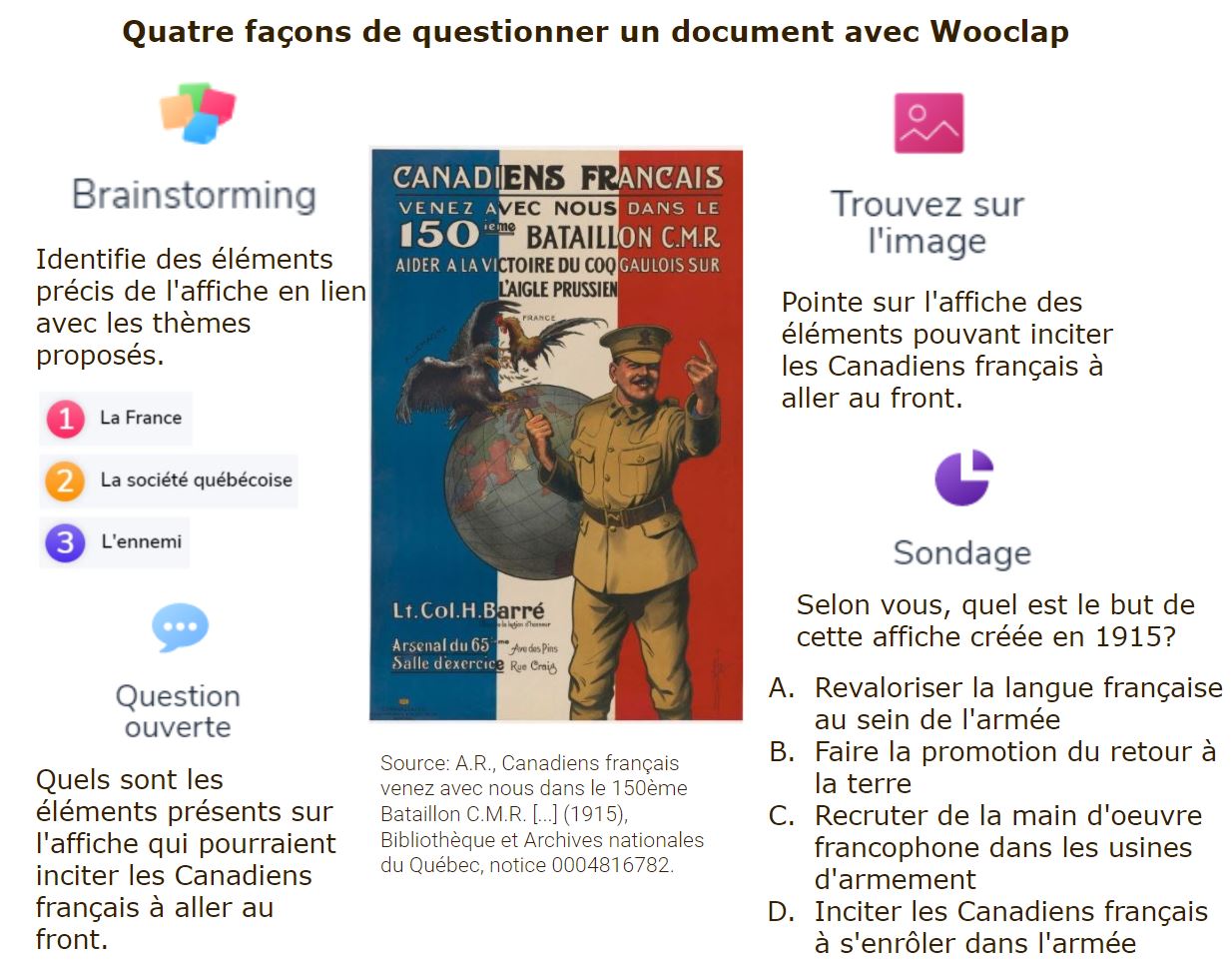 Wooclap offre une variété de fonctions (question ouverte, question à choix multiples, sondage, remue-méninge ou épingle sur image, etc.) permettant de questionner toute forme de documents (photo d’époque, graphique, bande dessinée, document écrit, caricature, etc.) De cette façon, en associant des questions au document proposé, il est possible d’accompagner les élèves dans l’analyse de documents.