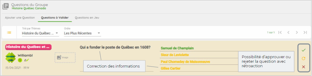 Agoraquiz permet ainsi à l’élève de formuler des questions et de les soumettre à son enseignant. Une fois validées par l’enseignant, les élèves peuvent faire des tournois amicaux en duo. La compilation statistique, jumelée à la formulation des questions et des choix de réponses proposés par les élèves permettent à l’enseignant de porter un regard sur l’intégration des apprentissages.