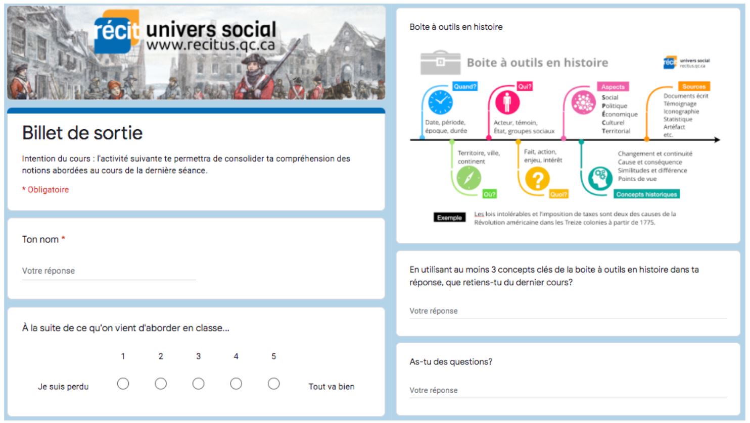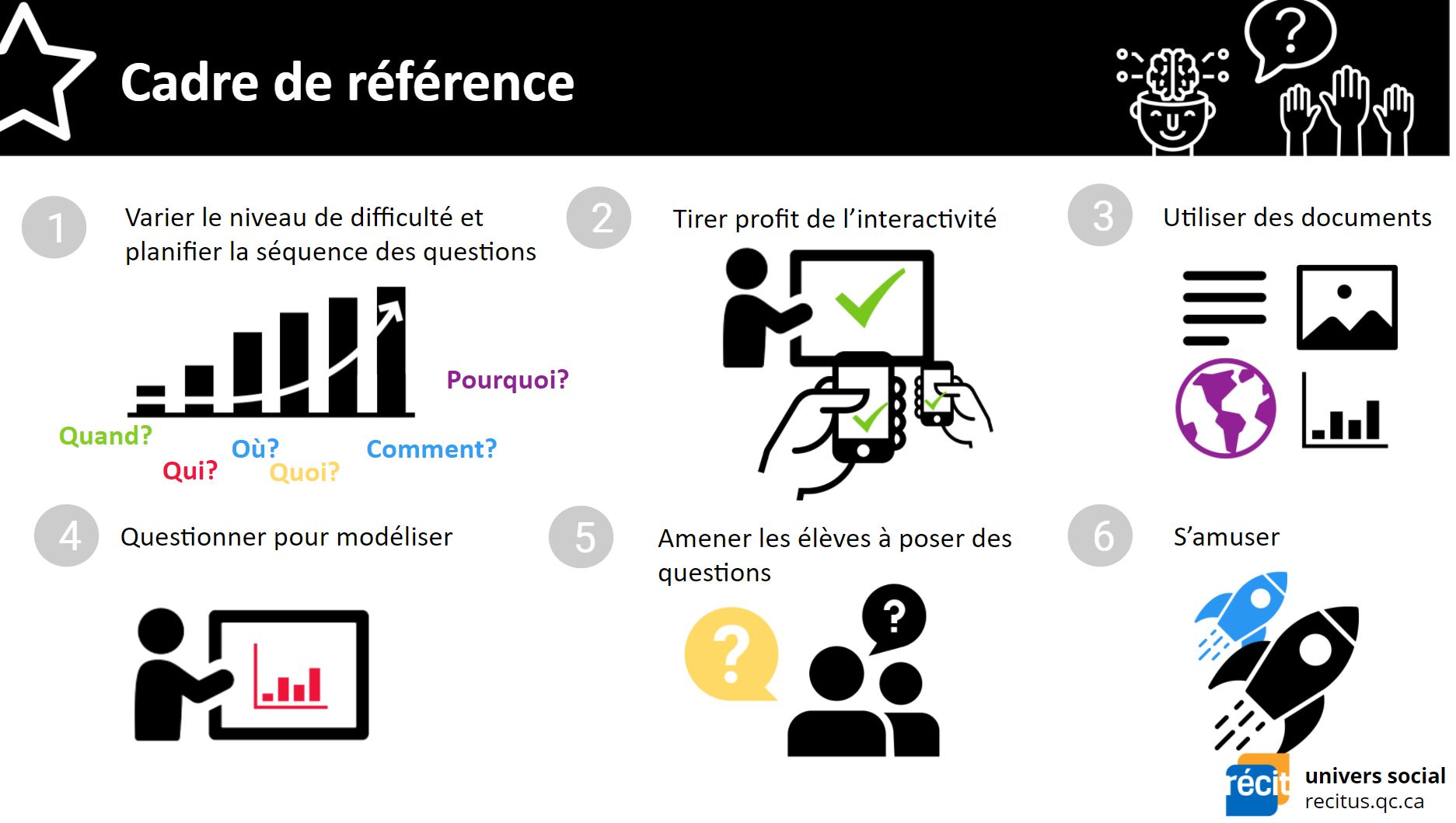 Les questionnaires interactifs constituent à la fois un outil et une approche didactiques privilégiés en classe d’univers social. L’aspect interactif augmente l’implication et la motivation des élèves et ce, en réinvestissant les contenus du cours. Ses possibilités d’utilisation en classe sont nombreuses et l’enseignant devra définir les intentions d’utilisation derrière l’utilisation du questionnaire interactif.