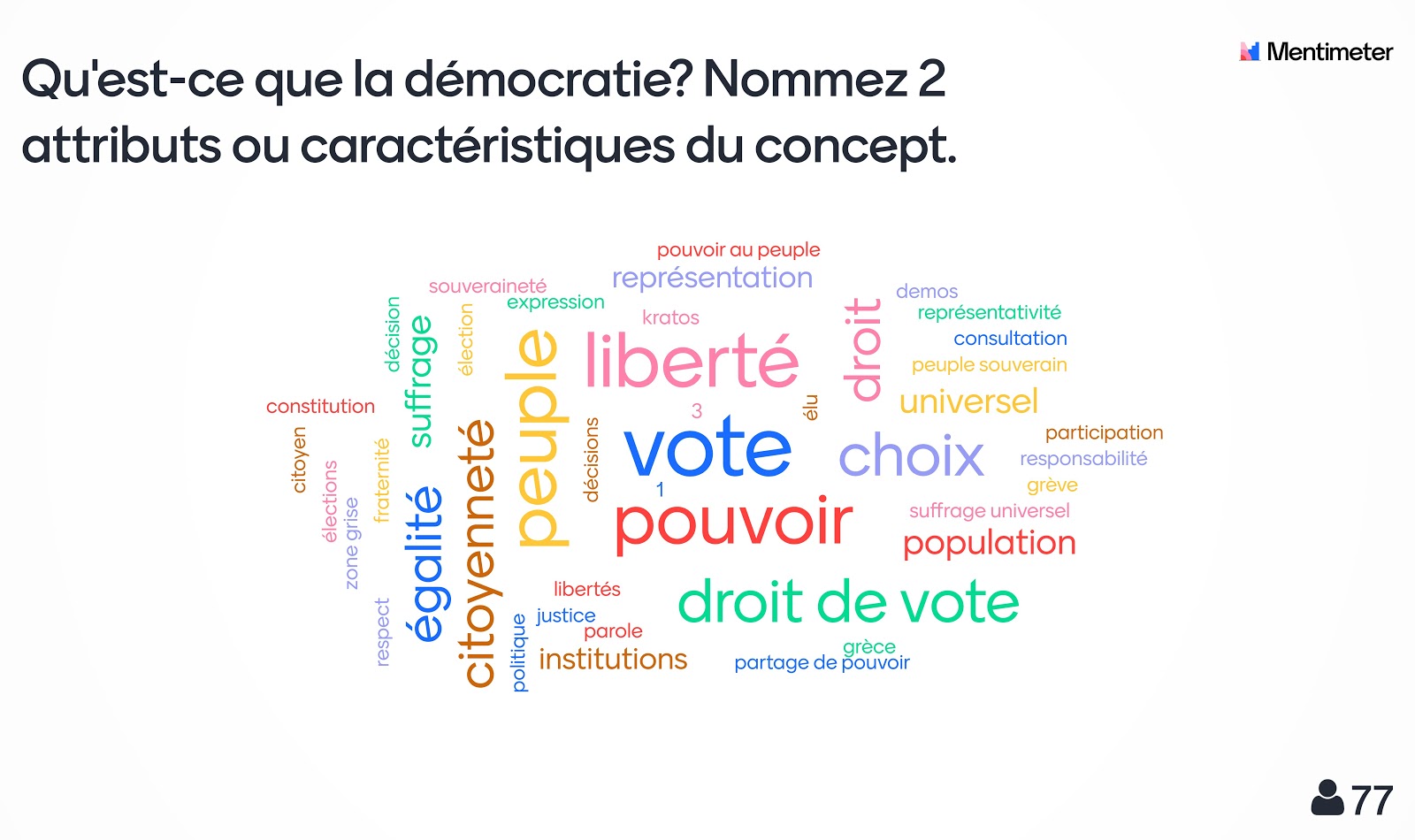 Mentimeter propose une fonction permettant la création de nuages de mots. Les élèves sont amenés par exemple à proposer deux ou trois mots ou concepts importants en lien avec une idée. Plus un concept revient souvent dans la classe, plus le mot s’affiche en grand format.